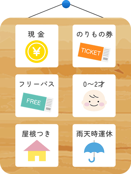 ・「ヘリコプター」「ミニメリーゴーランド」「キッズマート」「モーモー運送」「ようちえんバス」「汽車ポッポ」 (ロッキンタグ前)