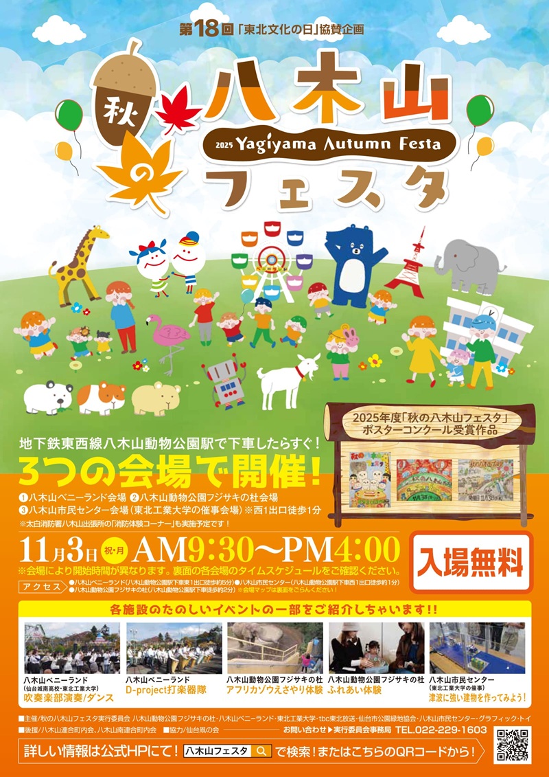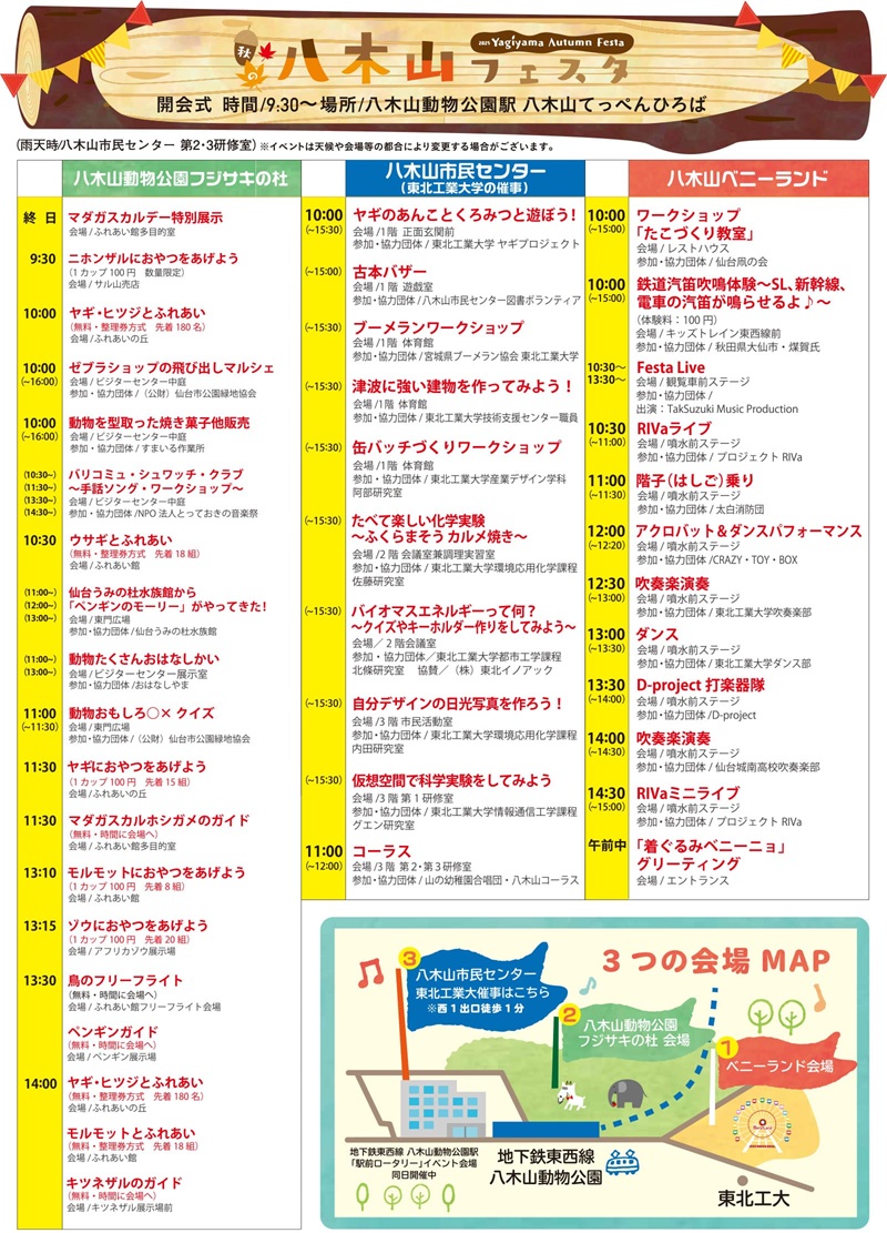 当日は、八木山ベニーランド、八木山動物公園フジサキの杜会場、八木山市民センター会場の3つの会場で同時開催!